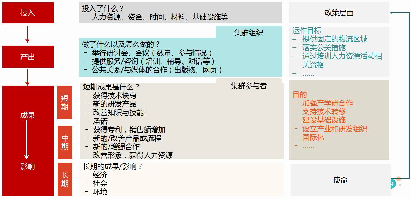 該體系將集群行動、管理作為投入和產出的全過程,所投入的資源作為“投入”,包括人力投入、財物投入等。產生的直接相關具體舉措作為“產出”,如發放宣傳手冊、舉辦培訓活動、顧問咨詢服務、研討會等。對預定目標所產生的直接結果為“成果”,包括了集群參與主體獲得的收益和態度、行為的轉變等。將對超出了集群政策目標的間接作用稱為“影響”,包括了對區域經濟、社會和環境的影響。在實際操作中,還需要基于這一評估體系,將具體的評估內容細化為相應的指標或問題,選擇適當的方法(見圖3)。
